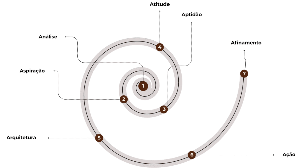 Ela é composta por 7 blocos de trabalho (os 7As), com duração recomendada de 12 semanas, e está representada em forma de espiral, simbolizando a essência do método, partindo do seu centro, da sua verdade, até ganhar forma no mundo.